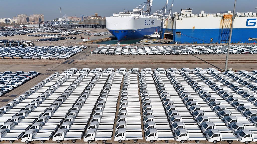 12月4日,汽车停正在山东口岸烟台港期待拆船(无人机照片)。发(唐克摄)?。