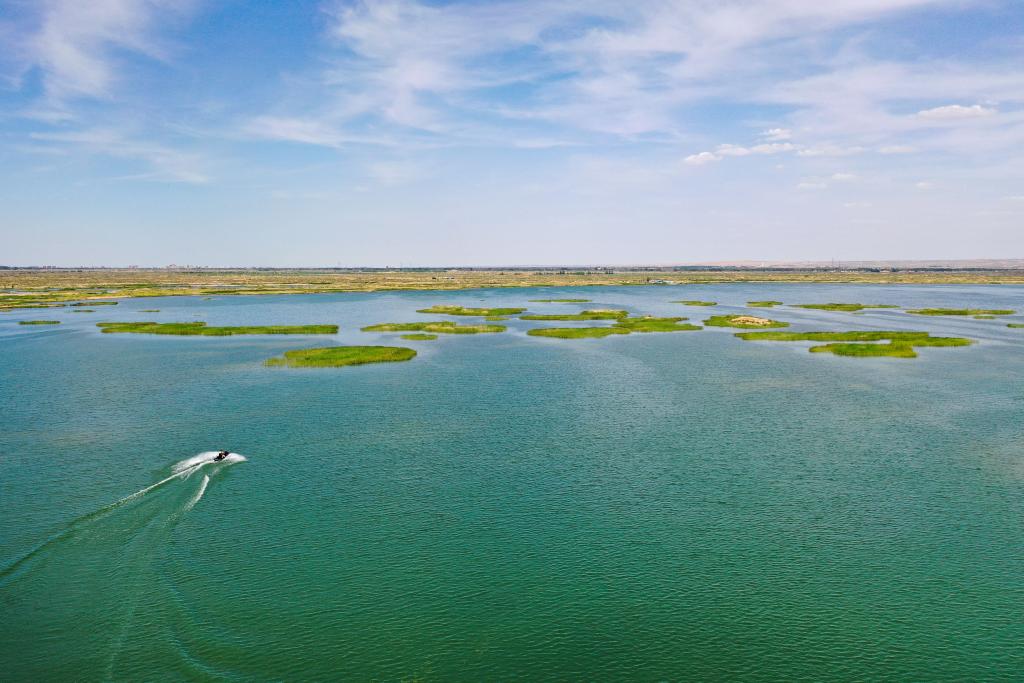6月5日,正在巴彦淖尔市磴口县奈伦湖国度湿地公园,摩托艇行驶正在湖面上(无人机照片)。黄河“几字弯”逐步展示“金沙蓝海绿洲”的斑斓画卷。记者 李志鹏 摄。